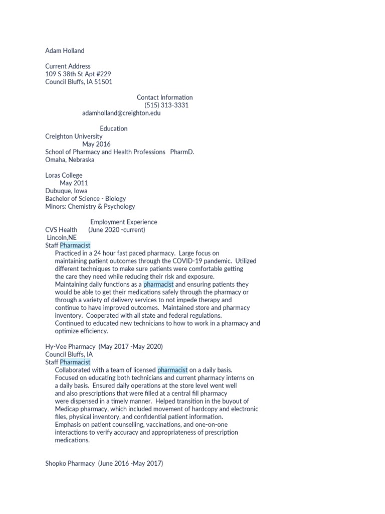 Hy-Vee Pharmacy (May 2017 -May 2020)