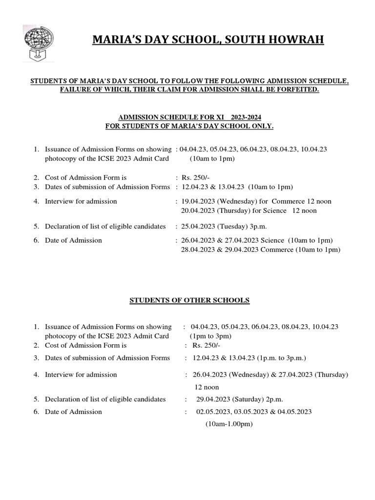 STUDENTS OF MARIA’S DAY SCHOOL TO FOLLOW THE FOLLOWING ADMISSION SCHEDULE,