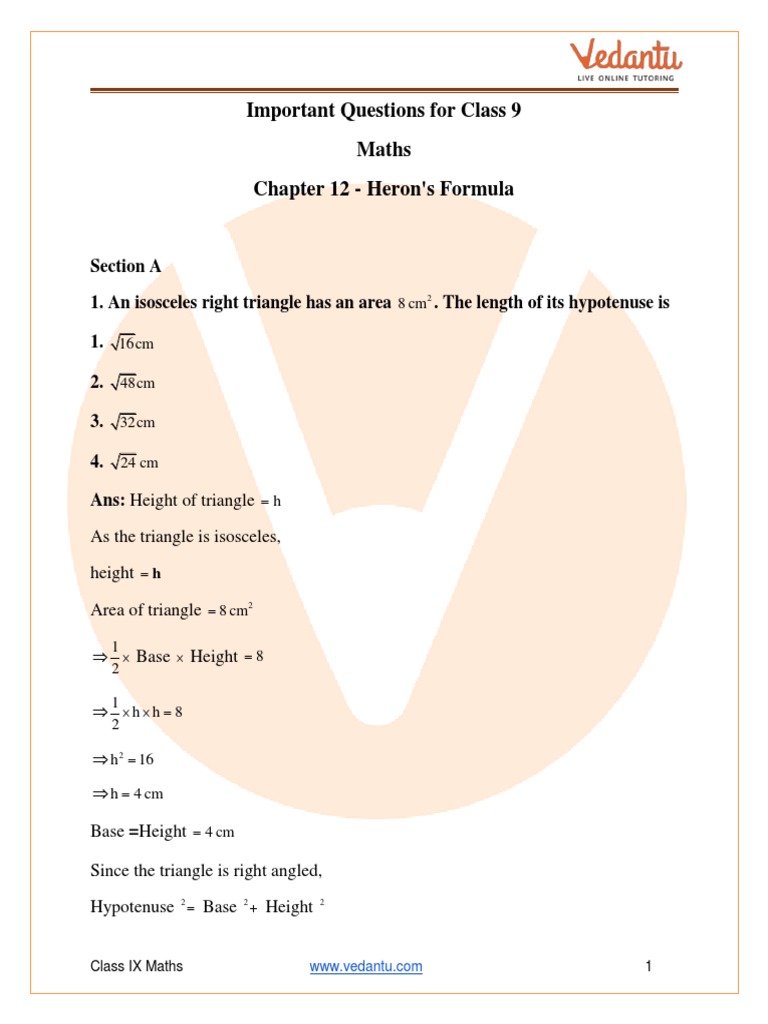 Important Questions For Class 9 Maths Chapter 12 - Heron's Formula