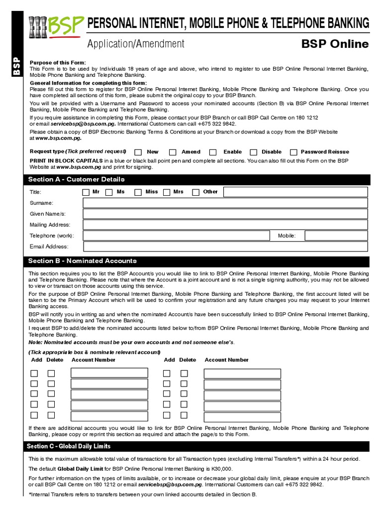 This Form is to be used by Individuals 18 years of age and above, who intend to register to use BSP Online Personal Internet Banking,