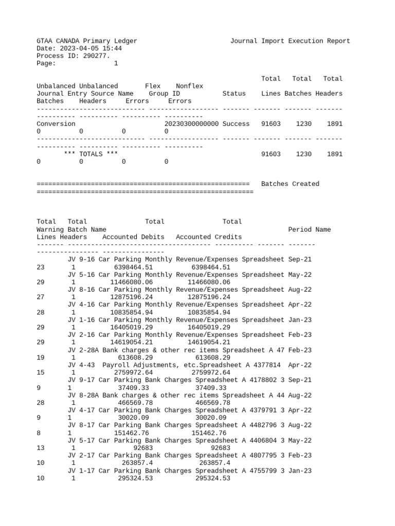 GTAA CANADA Primary Ledger Journal Import Execution Report
