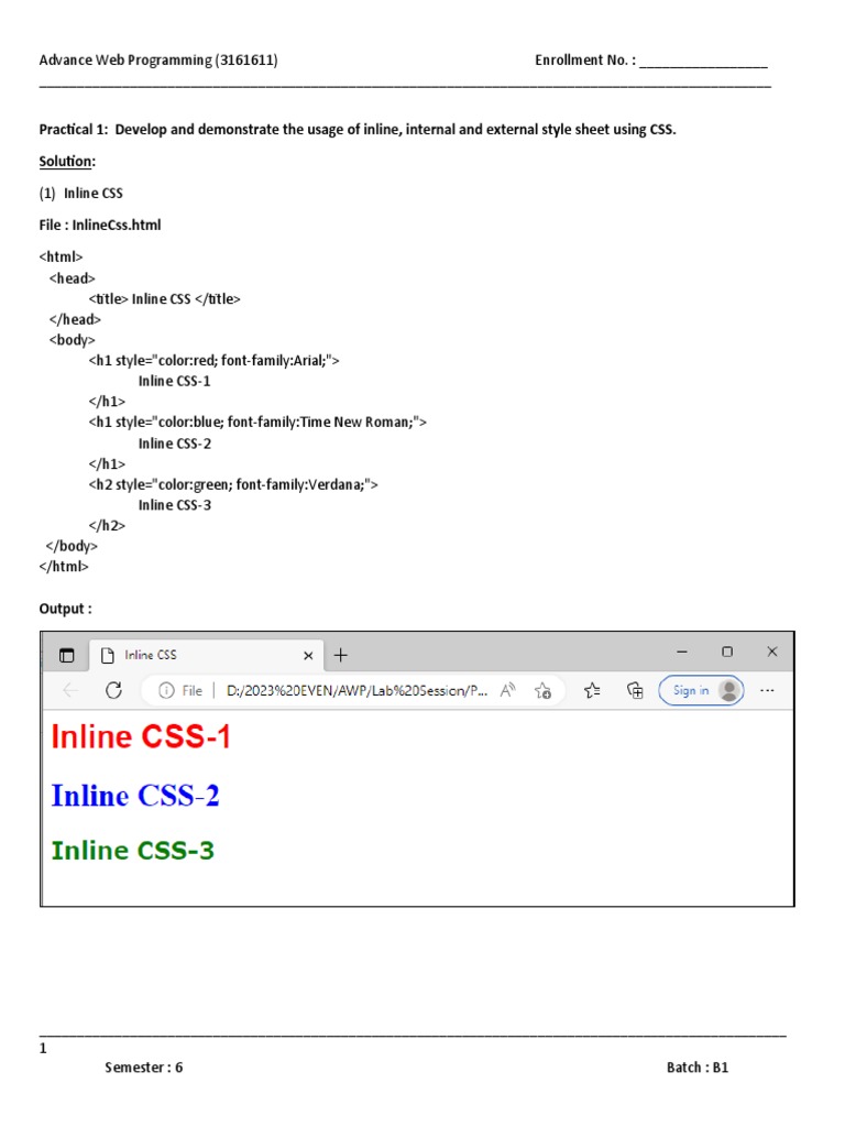 Practical 1: Develop and demonstrate the usage of inline, internal and external style sheet using CSS.