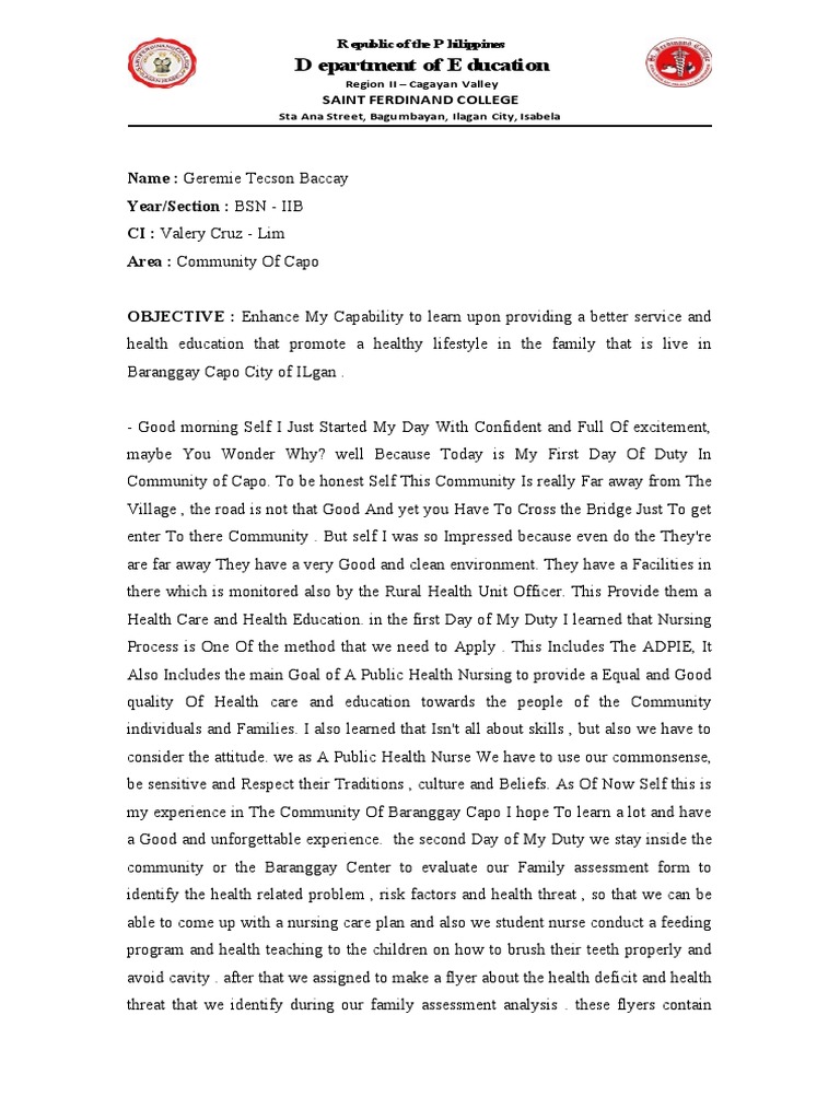 my experience in The Community Of Baranggay Capo I hope To learn a lot and have