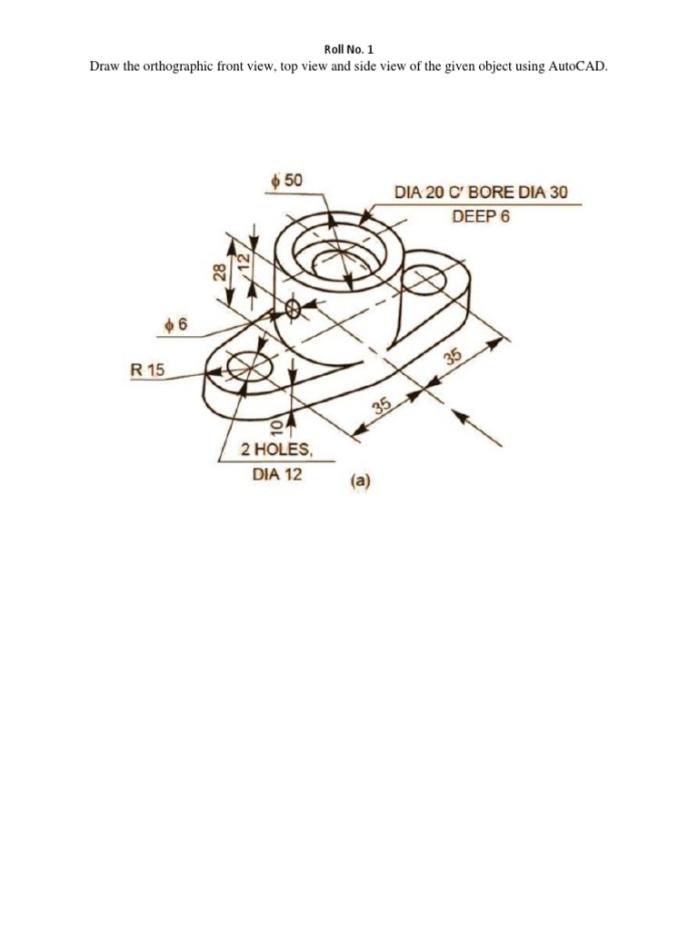 Draw the orthographic front view, top view and side view of the given object using AutoCAD.