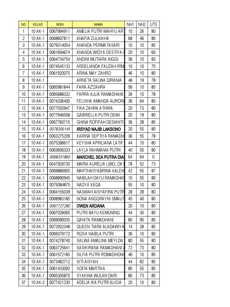 NO KELAS NISN NAMA NH1 NH2 UTS