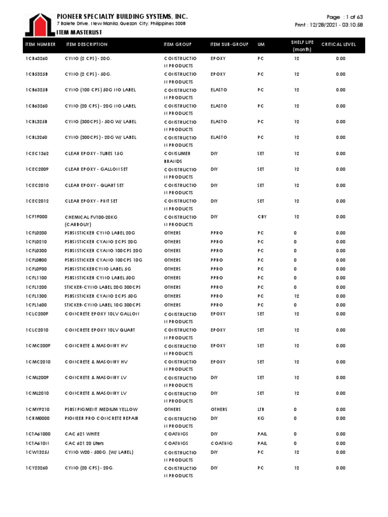 ITEM NUMBER ITEM DESCRIPTION ITEM GROUP ITEM SUB-GROUP UM SHELF LIFE CRITICAL LEVEL