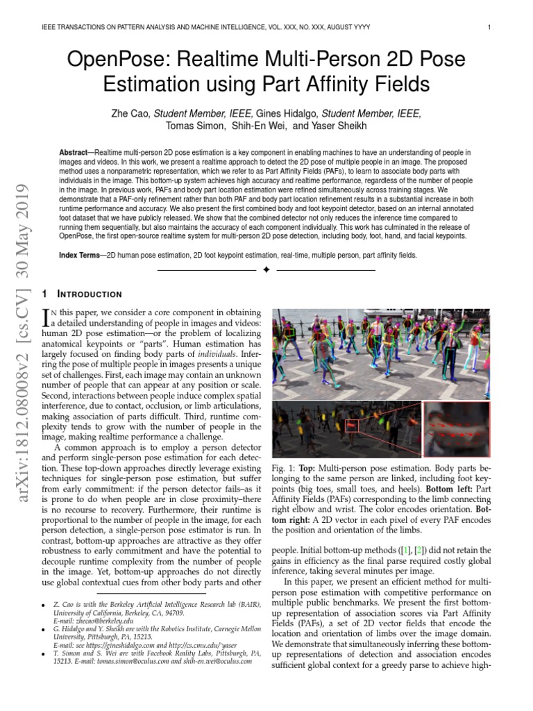 Abstract—Realtime multi-person 2D pose estimation is a key component in enabling machines to have an understanding of people in