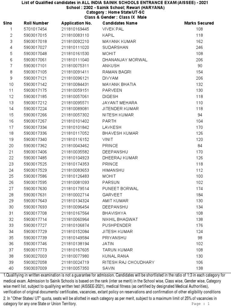 School : 2302 - Sainik School; Rewari (HARYANA)