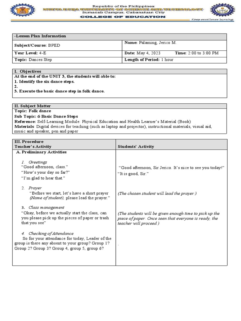 Topic: Dances Step Length of Period: 1 hour