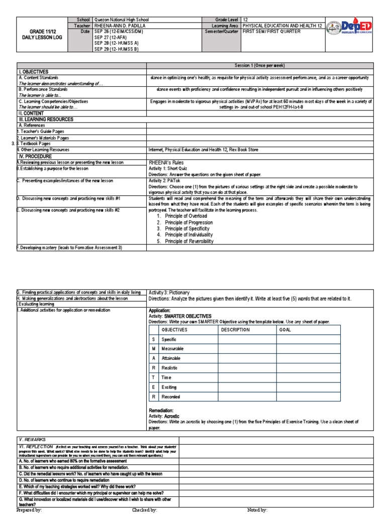 Teacher RHEENA-ANN D. PADILLA Learning Area PHYSICAL EDUCATION AND HEALTH 12