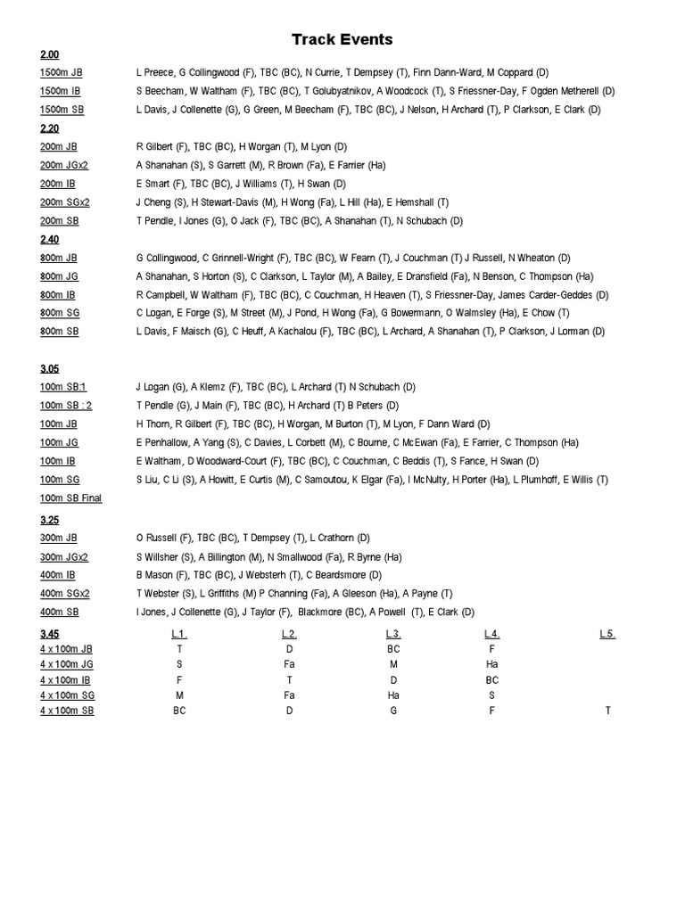 Triple Jump JB H Green, G Collingwood (F), TBC (BC), A Rai, Z McCouaig (T), J Russell, N Wheaton (D)