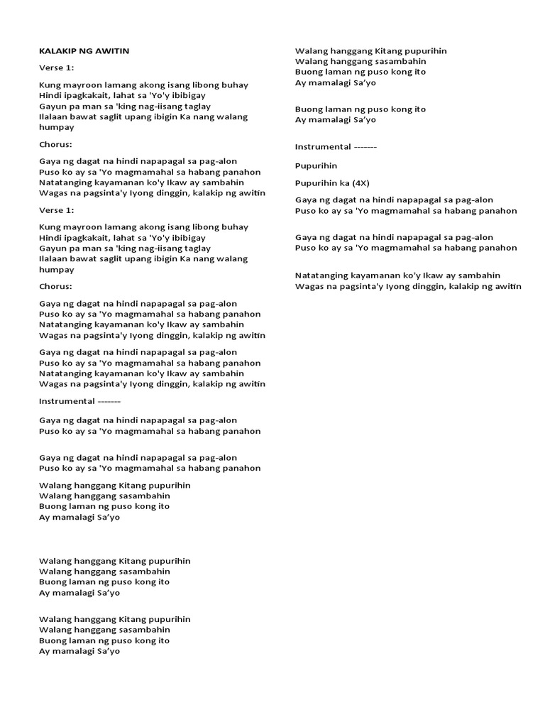 Chorus: Wagas na pagsinta'y Iyong dinggin, kalakip ng awitin