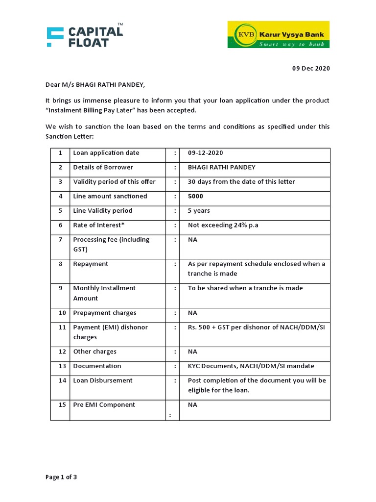 between the Lenders, Capital Float and the Borrower. This Sanction Letter forms part of the