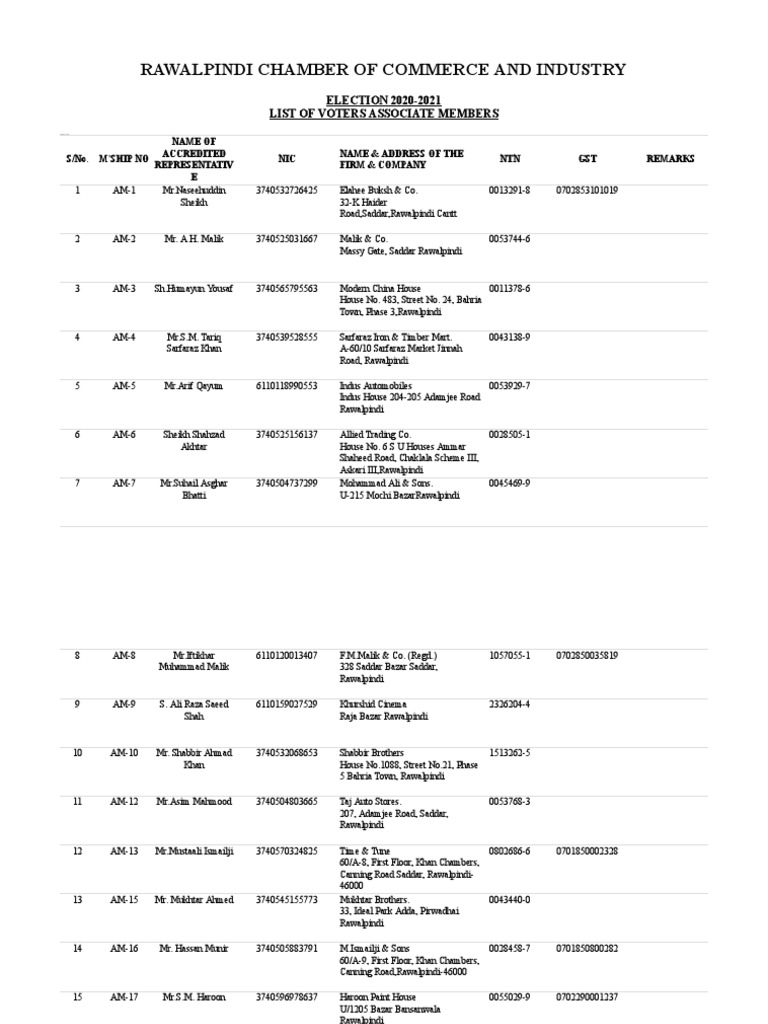 Rawalpindi Chamber of Commerce and Industry: ELECTION 2020-2021 List of Voters Associate Members