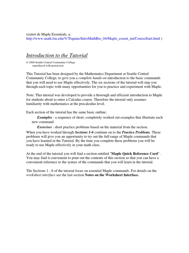 This Tutorial has been designed by the Mathematics Department at Seattle Central Community College, to give you a complete hands-on introduction to the basic commands that you will need to use Maple effectively. The six sections of the tutorial will step you through each topic with many opportunities for you to practice and experiment with Maple. Note: This tutorial was developed to provide a thorough and efficient introduction to Maple for students about to enter a Calculus course. Therefore the tutorial only assumes familiarity with mathematics at the precalculus level. Each section of the tutorial has the same basic outline: Examples : a sequence of short, completely worked out examples that illustrate each new command. Exercises : short practice problems based on the material from the section. When you have worked through Sections 1-6 continue on to the Practice Problems. These problems will give you an opportunity to try out the full range of Maple commands that you have learned in the Tutorial. By the time you complete these problems you will be ready to use Maple effectively in your math class. At the end of the tutorial you will find a section entitled "Maple Quick Reference Card" . You may find it convenient to print out the contents of this section so that you can have a convenient reference to the syntax of the commands that you will learn in the tutorial. The Sections 1 - 6 of the tutorial focus on essential Maple commands. For details on the worksheet interface see the last section Notes on the Worksheet Interface.