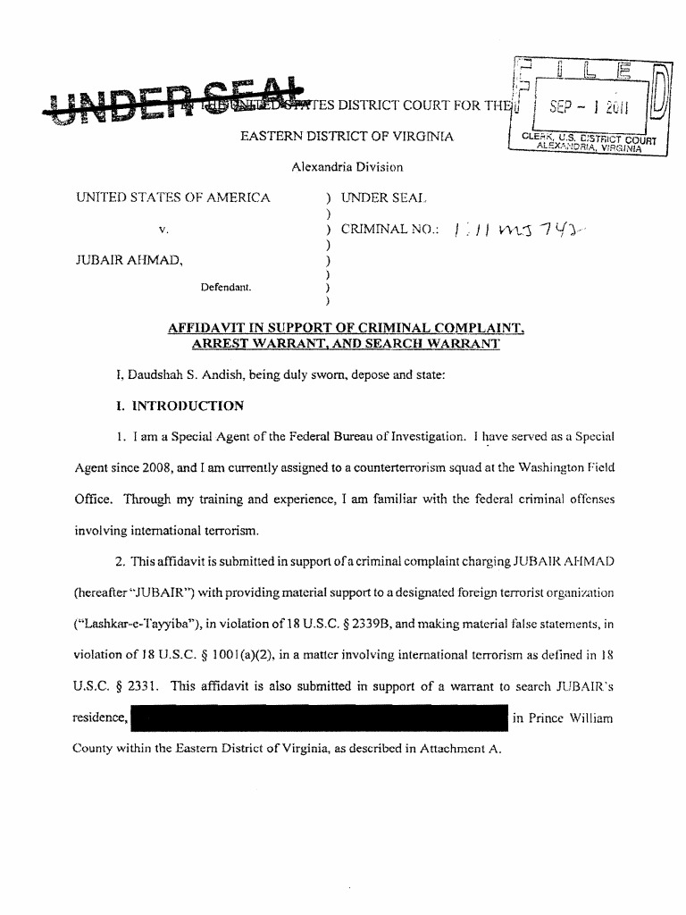 Agent since 2008, and I am currently assigned to a counterterrorism squad at the Washington Field Office. 'TIll'Ough my training and experience, I am familiar with the federal criminal offenses involving international terrorism. 2. This affidavit is submitted in support ofa criminal complaint charging JUBAIR AHMAD (hereafter "JUBAIRH) with providing material support to a designated foreign terrorist organi71ltion ("Lashkar-e-Tayyiba"), in violation of 18 U.S.C. 2339B, and making material false statements, in violation of 18 U.S.C. 100 J(a)(2), in a matter involving international terrorism as detlned in 18