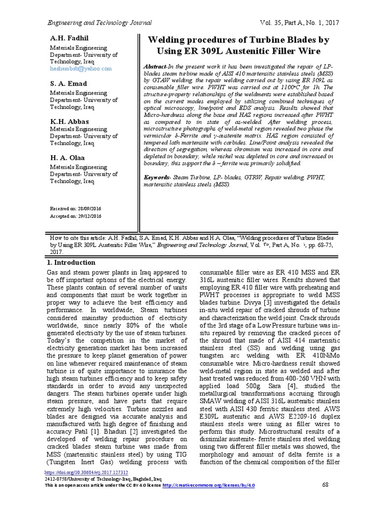 by Using ER 309L Austenitic Filler Wire,” Engineering and Technology Journal, Vol. 53, Part A, No. 1, pp. 68-75,