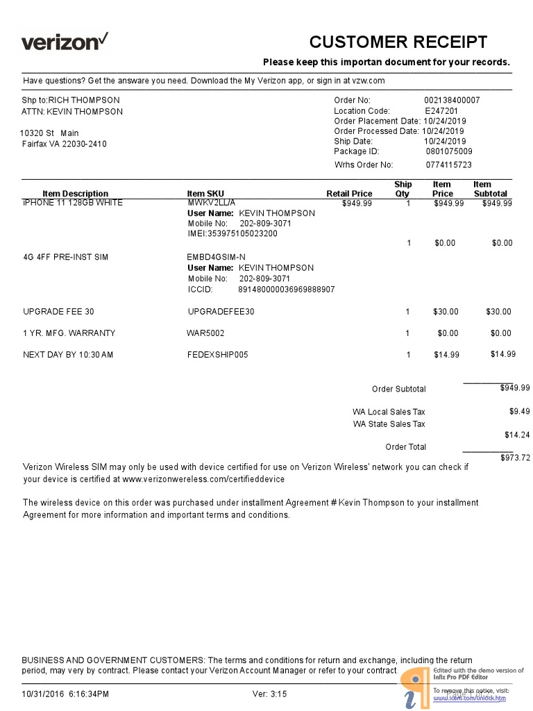 The wireless device on this order was purchased under installment Agreement # Kevin Thompson to your installment