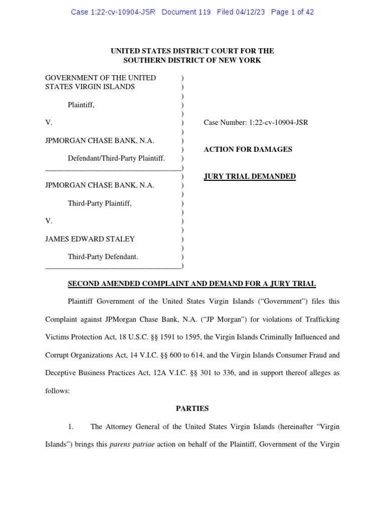 U.S. Virgin Island V JPMorgan Chase Bank N.A. Second Amended Complaint Filed April 12 2023