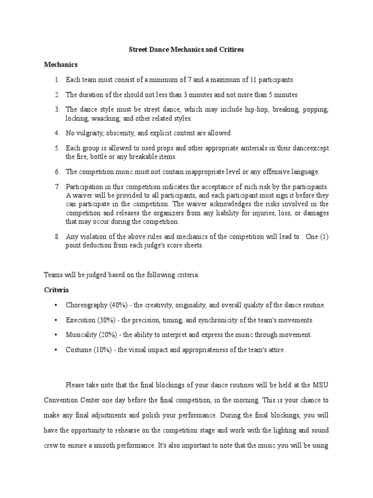 3. The dance style must be street dance, which may include hip-hop, breaking, popping,
