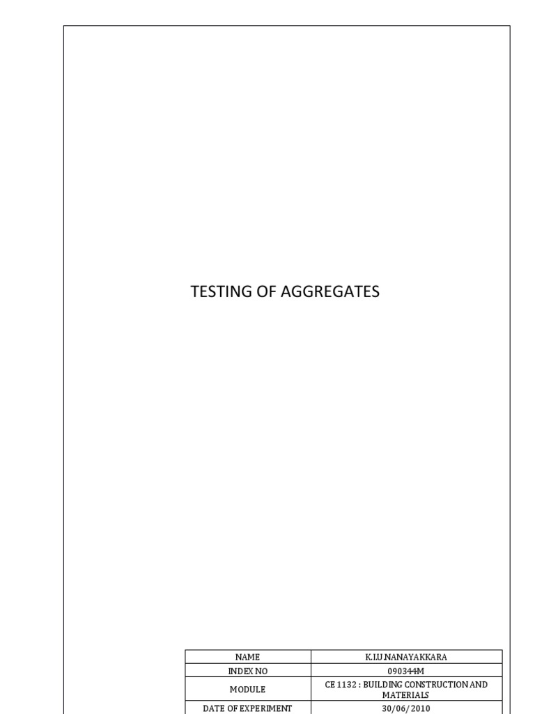 It is necessary to check suitability of aggregates from a new aggregate quarry for making structural concrete. In addition, it is also necessary to test the aggregates to obtain relevant properties for concrete mix design. Aggregates used in concrete are divided into two categories as coarse and fine aggregates. Crush rock and river sand are the most common coarse and fine aggregates, respectively, used in Sri Lanka. Since approximately three quarters of the volume of concrete is occupied by aggregate, its quality has a considerable influence on the durability and structural performance of concrete. Some of the important properties of aggregates which affect the properties of both fresh and hardened concrete are, a) b) c) d) e) Particle size distribution (Grading). Shape and surface texture of particles. Physical properties (e.g. specific gravity, water absorption, porosity, etc.) Mechanical Properties (e.g. strength, toughness, hardness, etc.) Chemical and thermal properties.
