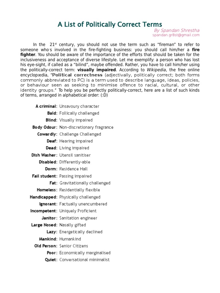 In the 21st century, you should not use the term such as fireman to refer to someone whos involved in the fire-fighting business: you should call him/her a fire fighter. You should be aware of the importance of the efforts that should be taken for the inclusiveness and acceptance of diverse lifestyle. Let me exemplify: a person who has lost his eye-sight, if called as a bilind, maybe offended. Rather, you have to call him/her using the politically-correct term: visually impaired. According to Wikipedia, the free online encyclopdia, Political correctness (adjectivally, politically correct; both forms commonly abbreviated to PC) is a term used to describe language, ideas, policies, or behaviour seen as seeking to minimise offence to racial, cultural, or other identity groups. To help you be perfectly politically-correct, here are a list of such kinds of terms, arranged in alphabetical order: (:D) A criminal: Unsavoury character Bald: Follically challenged Blind: Visually impaired Body Odour: Non-discretionary fragrance Cowardly: Challenge Challenged Deaf: Hearing impaired Dead: Living impaired Dish Washer: Utensil sanitiser Disabled: Differently-able Dorm: Residence Hall Fail student: Passing impaired Fat: Gravitationally challenged Homeless: Residentially flexible Handicapped: Physically challenged Ignorant: Factually unencumbered Incompetent: Uniquely Proficient Janitor: Sanitation engineer Large Nosed: Nasally gifted Lazy: Energetically declined Mankind: Humankind Old Person: Senior Citizens Poor: Economically marginalised Quiet: Conversational minimalist