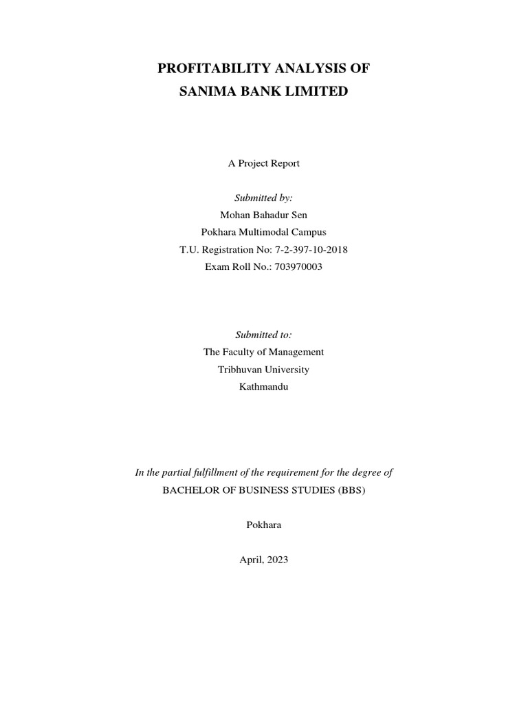 The project work report entitled “PROFITABILITY ANALYSIS OF SANIMA BANK