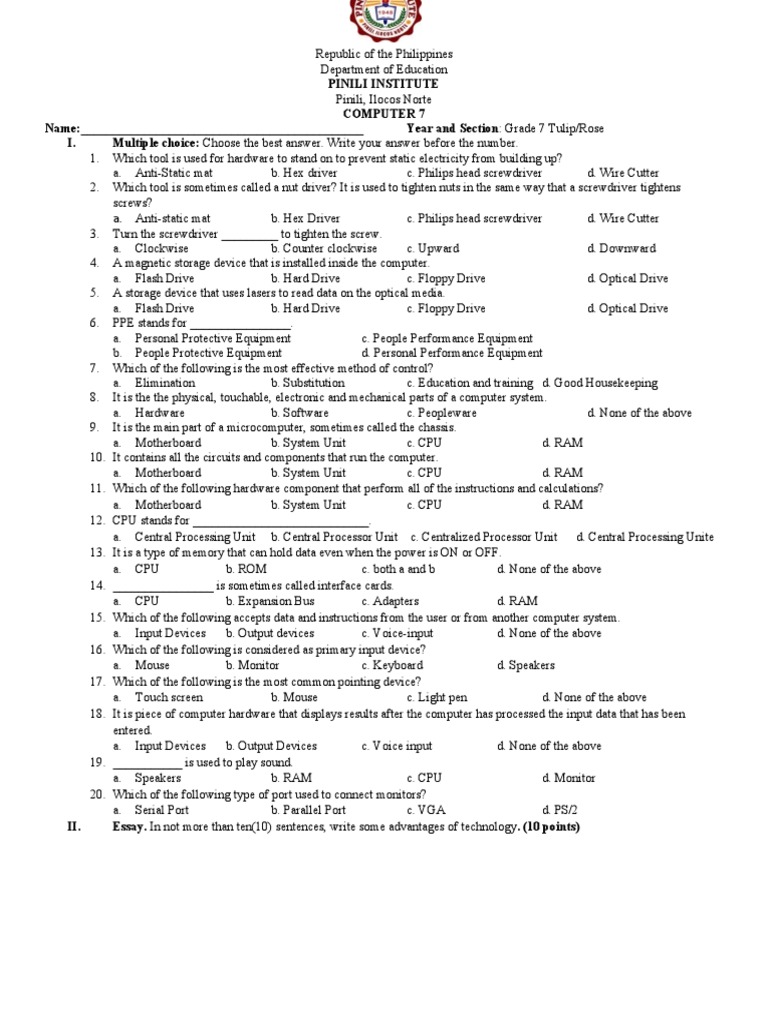 II. Essay. In not more than ten(10) sentences, write some advantages of technology. (10 points)