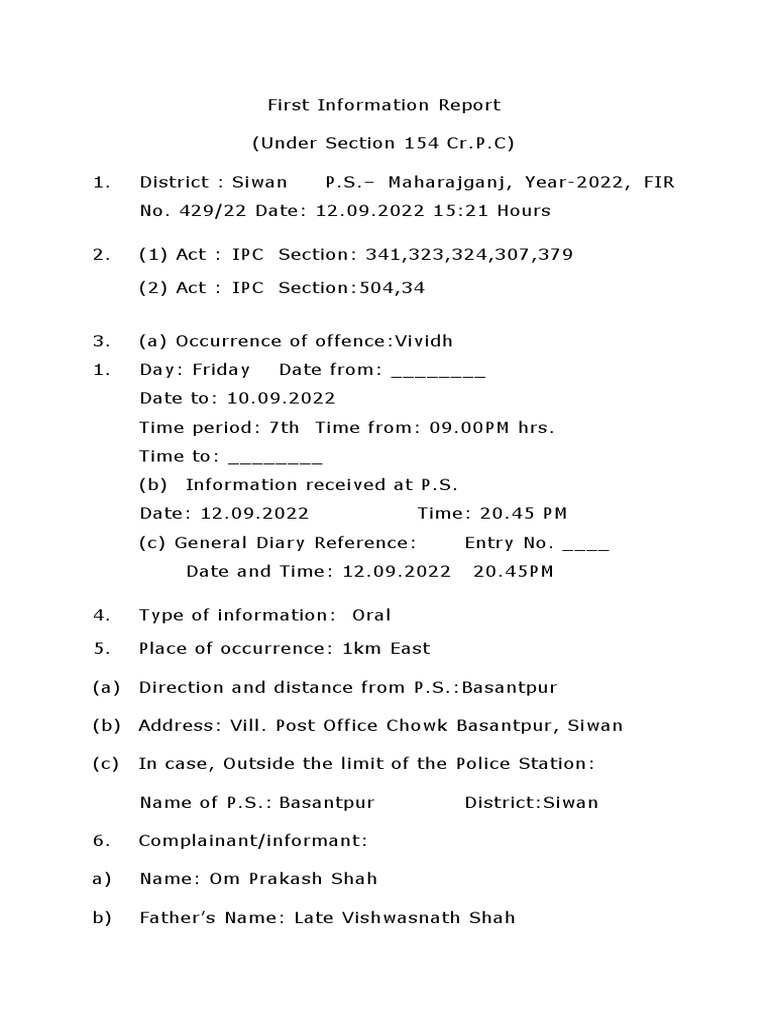 1. District : Siwan P.S.– Maharajganj, Year-2022, FIR