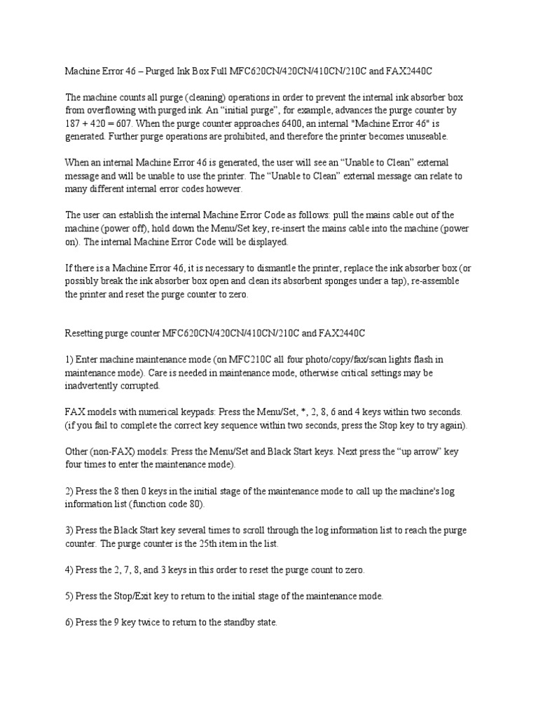 Resetting purge counter MFC620CN/420CN/410CN/210C and FAX2440C 1) Enter machine maintenance mode (on MFC210C all four photo/copy/fax/scan lights flash in maintenance mode). Care is needed in maintenance mode, otherwise critical settings may be inadvertently corrupted. FAX models with numerical keypads: Press the Menu/Set, *, 2, 8, 6 and 4 keys within two seconds. (if you fail to complete the correct key sequence within two seconds, press the Stop key to try again). Other (non-FAX) models: Press the Menu/Set and Black Start keys. Next press the up arrow key four times to enter the maintenance mode). 2) Press the 8 then 0 keys in the initial stage of the maintenance mode to call up the machine's log information list (function code 80). 3) Press the Black Start key several times to scroll through the log information list to reach the purge counter. The purge counter is the 25th item in the list. 4) Press the 2, 7, 8, and 3 keys in this order to reset the purge count to zero. 5) Press the Stop/Exit key to return to the initial stage of the maintenance mode. 6) Press the 9 key twice to return to the standby state.