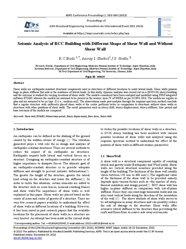 Keywords:: Shear wall, ETABS, Natural time period, Storey displacement, Base shear, Storey drift