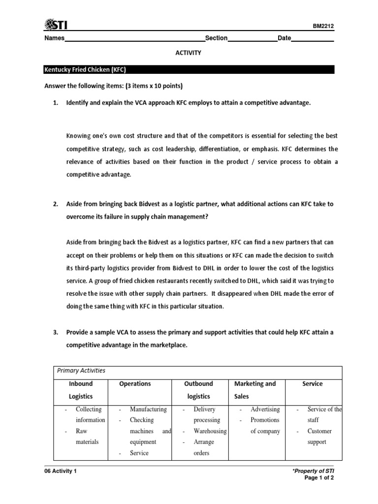 1. Identify and explain the VCA approach KFC employs to attain a competitive advantage.