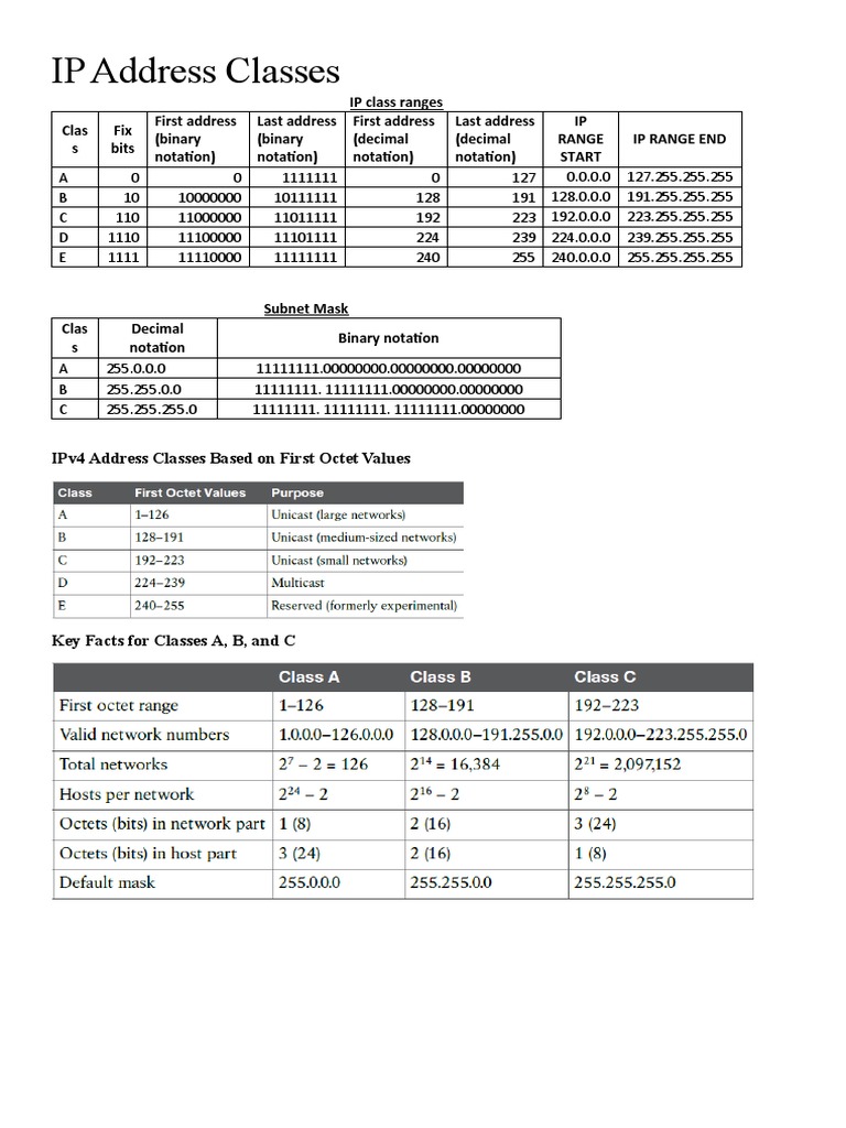 IPv4 Address Classes Based on First Octet Values