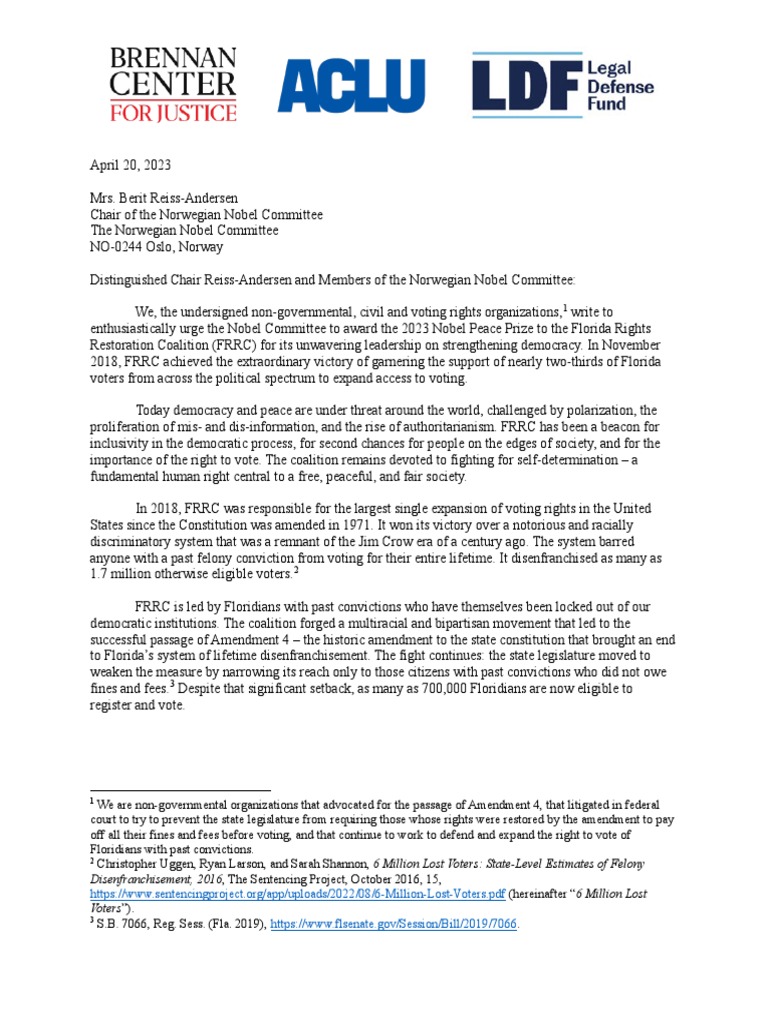 enthusiastically urge the Nobel Committee to award the 2023 Nobel Peace Prize to the Florida Rights