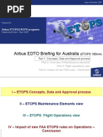 CHAPTER 3: OPERATIONAL APPROVAL: HOW TO GET IT .......................... 43 1GENERAL.......................................................................................... 45 a) Is ETOPS required ?.................................................................... 45 b) ETOPS is required, which diversion time ? ................................. 48 c) How to get ETOPS operational approval:.................................... 50 2CRITERIA TO OBTAIN OPERATIONAL APPROVAL....................... 51 a) b) c) d) e) f) g) 3Diversion time required and ETOPS approval plan ..................... 52 Aircraft configuration.................................................................... 52 Maintenance practices................................................................. 52 ETOPS training............................................................................ 54 In-service reliability ...................................................................... 57 Operational readiness/documentation ......................................... 57 Validation flight ............................................................................ 60