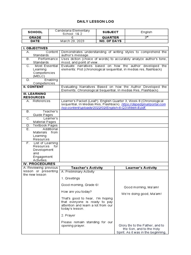 sequential, In Medias Res, Flashback). https://depedgmalrportal.com