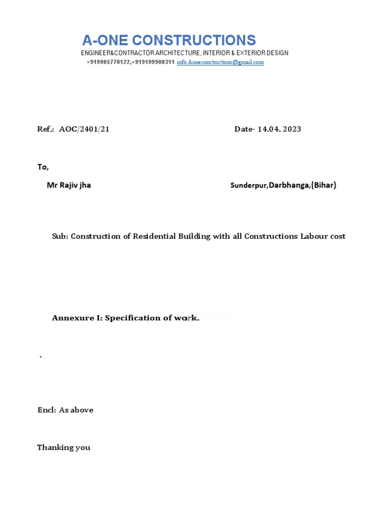 Sub: Construction of Residential Building with all Constructions labour cost.