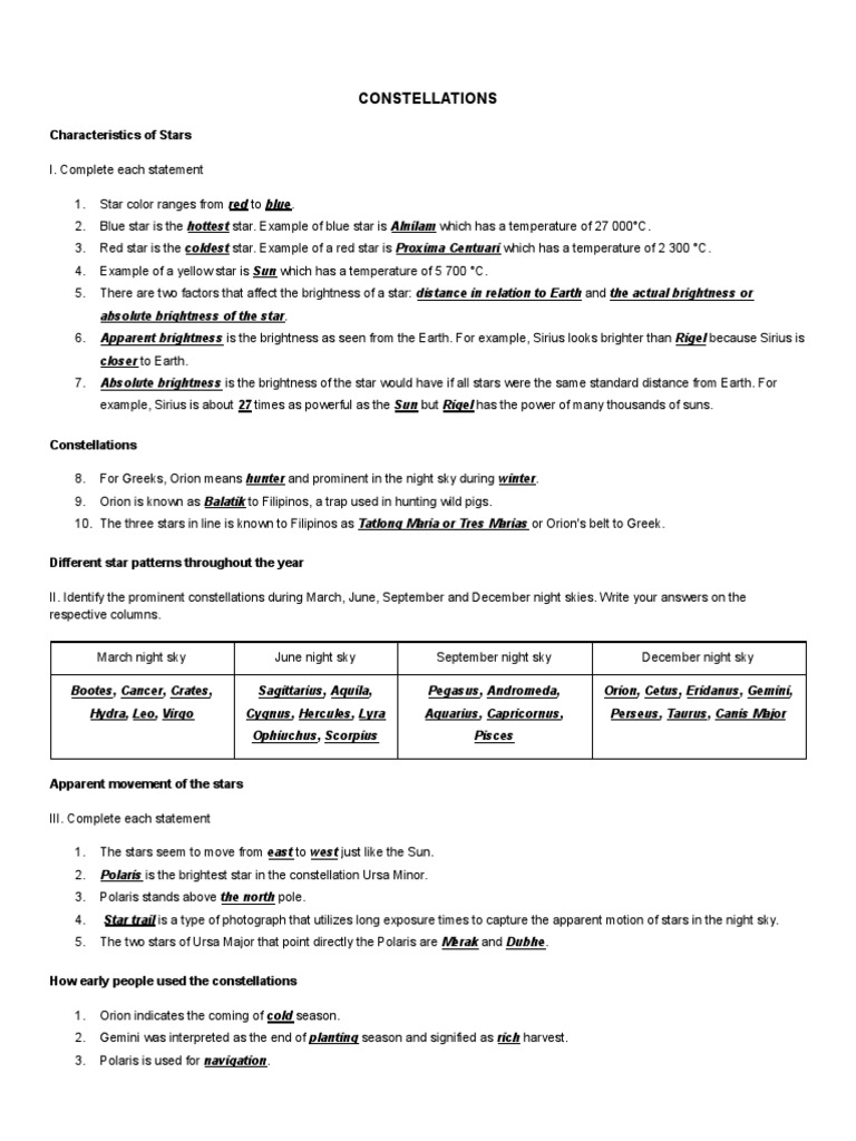 II. Identify the prominent constellations during March, June, September and December night skies. Write your answers on the