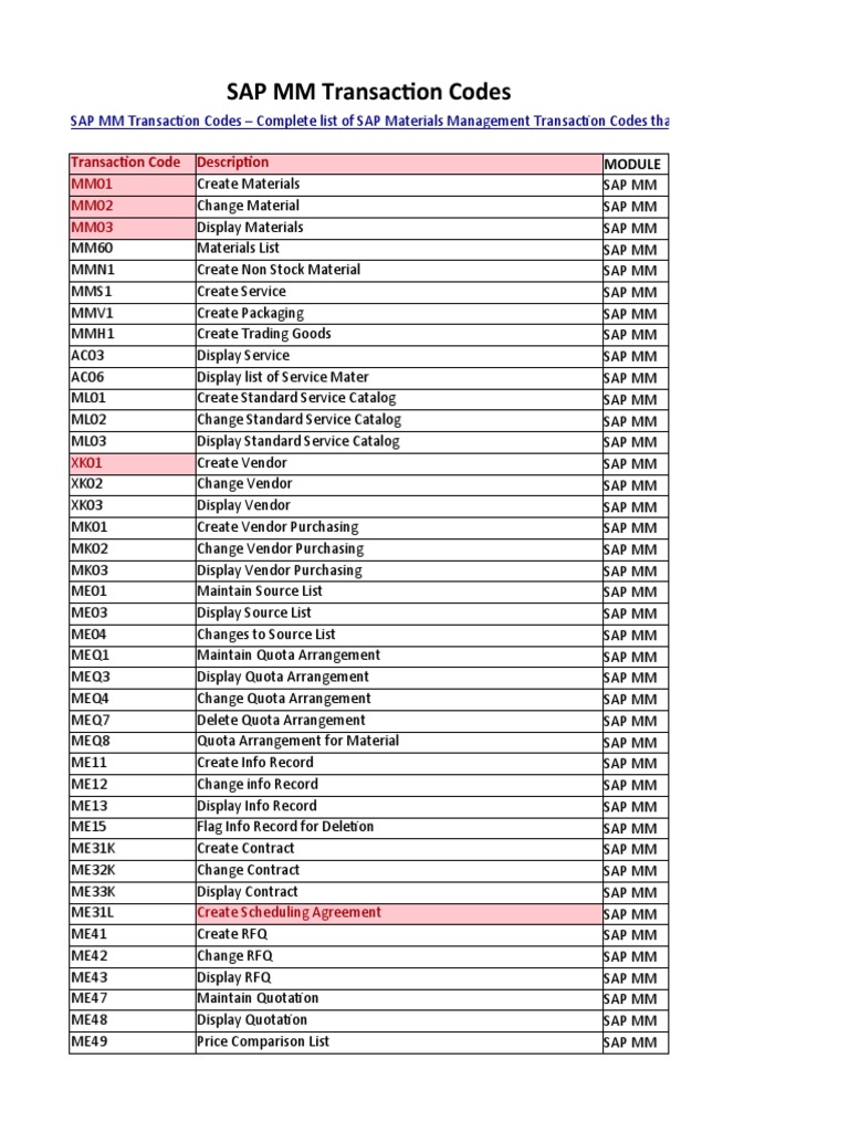 SAP MM Transaction Codes – Complete list of SAP Materials Management Transaction Codes that are used for configuration a