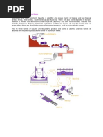 feed alumina to the pot. As the carbon anode is gradually consumed, it is periodically lowered to maintain the optimum distance of 5cm between the anode and cathode surfaces. For each ton of aluminium produced about 430 kg of carbon is consumed. A continuous supply of anodes is manufactured at both smelters in dedicated carbon plants that comprise paste plants, carbon bake furnaces and rodding shops. 1. In the paste plants, carefully crushed and graded fractions of calcined petroleum coke and recycled anode butts are heated and mixed with molten pitch. 2. The hot mixture is then compacted into blocks called green (unbaked) anodes. At Hillside, each anode weighs about 836 kg; at Bay side the anodes weigh about 624 kg. Approximately 400 000 anodes are produced each year for both smelters. 3. The green anodes are transferred to the carbon bake furnaces where they are heated in deep brick-lined pits to around 1 100C over a period of 21 days. This baking process calcines the binding pitch and ensures that the anodes have good thermal and electrical conductivity. Exhaust manifolds collect waste gases and carry them to the fume treatment centre. 4. After baking, aluminium rods are attached to the anodes and sealed with cast iron. The rod suspends the anode in the pot and acts as an electrical conductor. 5. After the rods are attached, the anodes are delivered to the pot rooms for positioning in the pots. Some 27 days later, the remains of the anodes, known as butts, are returned from the pot rooms and recycled. The rods are also reused. 1. The molten metal is tapped from each pot approximately once per day for transfer in special-purpose hot-metal carriers to holding furnaces in the cast house. The furnaces are heated and maintain the aluminium at the desired casting temperature of 700C. 2. After the aluminium is poured into cast house. furnaces, elements such as silicon, magnesium, copper, iron, titanium or boron are added to meet requisite alloy specifications. The metal surface is skimmed to remove the dross. The clean alloy is then cast. 3. Forty-four 22-kg ingots are stacked in a configuration of interlocking bundles. Each weighing one ton, they are strapped and trucked to the export stockyard at the harbor in an around-the-clock road haulage super packs for easy handling. The electrolytic production of aluminium at the smelters is a complex 24-hours-a-day, 365days-a-year process, dependant on a regular supply of raw materials and huge amounts of energy. Crucially important is the role of the ancillary departments that must ensure an uninterrupted supply of quality raw materials, spares, consumables or services to the three primary production areas - carbon, pot rooms and cast house. The ancillary departments include maintenance, procurement, materials management, laboratory, environment, finance, human resources, engineering, sales and marketing, communication and information systems. The warehouses contain tens of thousands of parts necessary for the continued functioning of the smelters. While certain specialised parts are purchased abroad, Billiton Aluminium's purchasing policy gives preference, on a competitive basis, to local suppliers and contractors. Preventative maintenance is a key factor in the successful operation of the smelter. Effective planning and organisation of maintenance work prevents production backlogs, keeps equipment in top condition and ensures that productivity remains high. Integrated information and technology systems are vital to Hillside's success as the focus of organisations worldwide turns to knowledge as a prime source of wealth creation. Designed for maximum effectiveness, the company's three-level information network is fully integrated and encompasses programmers to operate equipment, monitor performance and provide status reports. It also manages the business systems for finance, maintenance and human resources. References: Web site : http://www.hillside.co.za/history/production.html Aluminium ore, most commonly bauxite, is plentiful and occurs mainly in tropical and subtropical areas: Africa, West Indies, South America and Australia. There are also some