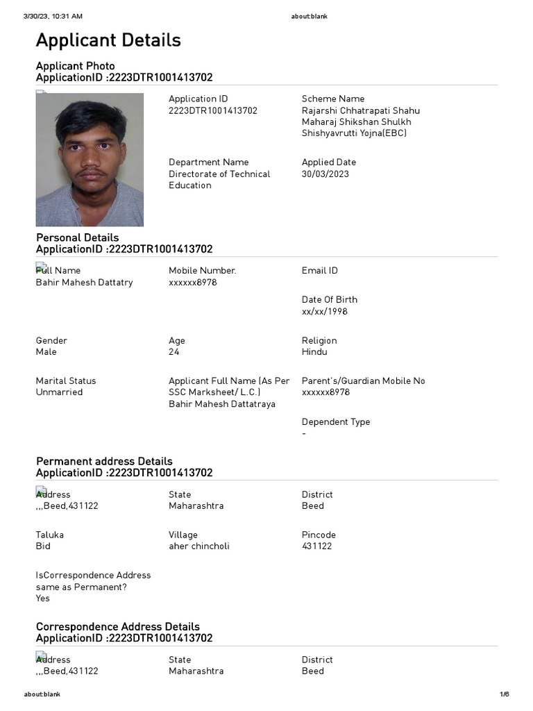 Marital Status Applicant Full Name (As Per Parent's/Guardian Mobile No