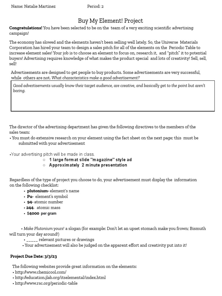 increase element sales! Your job is to choose an element to focus on, research it, and “pitch” it to potential