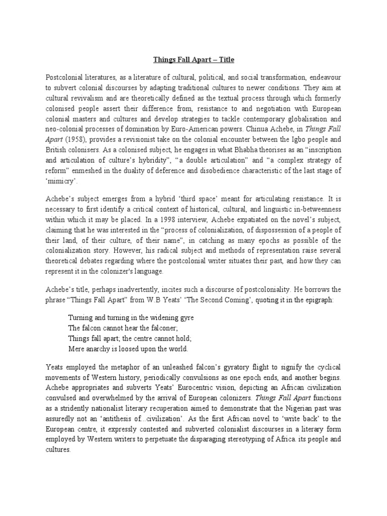enter the wider colonial picture, Achebe’s title, and epigraph from Yeats — “things fall apart, the