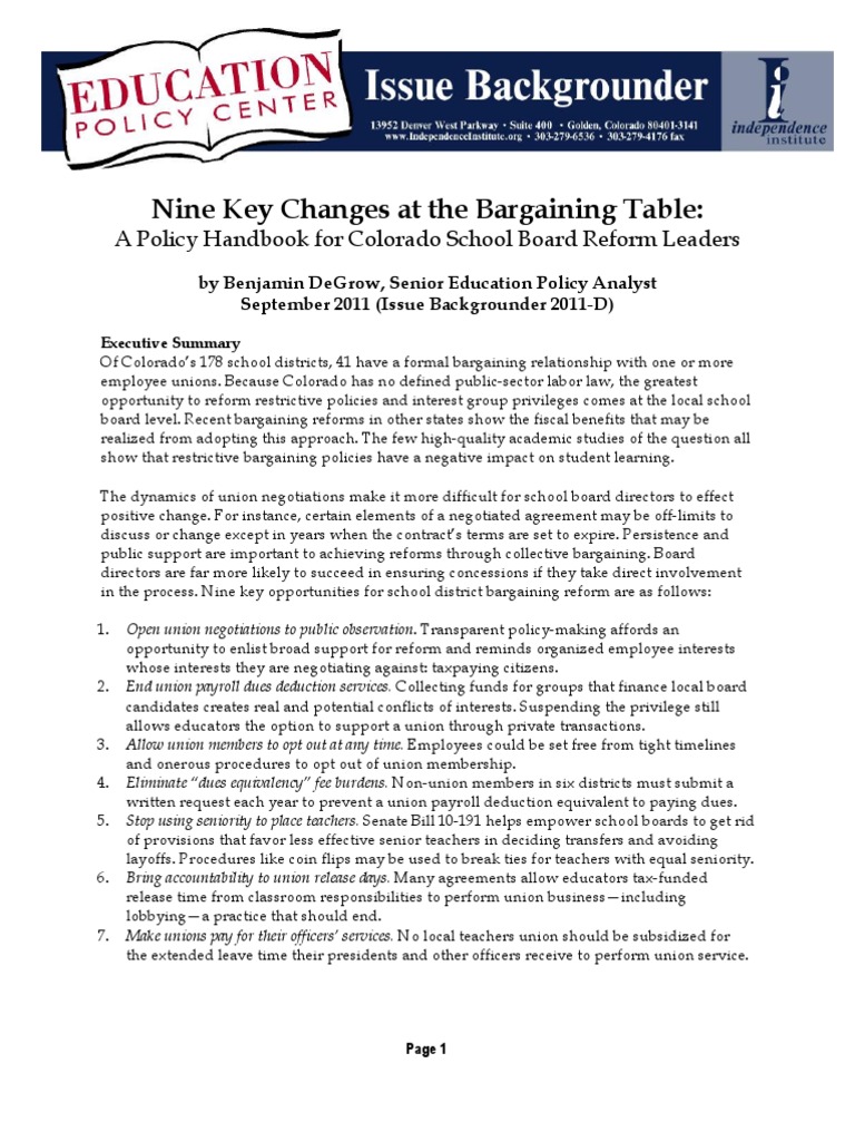 Citizens continue to expect the delivery of high-quality learning through accountable public school systems. After decades of mostly rising per-pupil revenues, recent revenue challenges have renewed interest in public education productivity. And more taxpaying citizens are actively engaged with concerns about high levels of government spending and debt. All these factors combine to provide local school boards with opportunities to find more productive educational approaches and to fulfill their responsibilities to promote effective classroom instruction, to serve as stewards of taxpayer dollars, and to treat employees fairly. The restrictive rules, unaccountable privileges and other unjust provisions in union bargaining agreements provide numerous open doors for board directors to make valuable changes. Emboldened local Colorado education leaders face a window of opportunity to challenge entrenched interests and deliver needed reforms at the bargaining table.