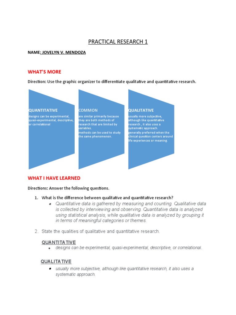 Direction: Use the graphic organizer to differentiate qualitative and quantitative research.