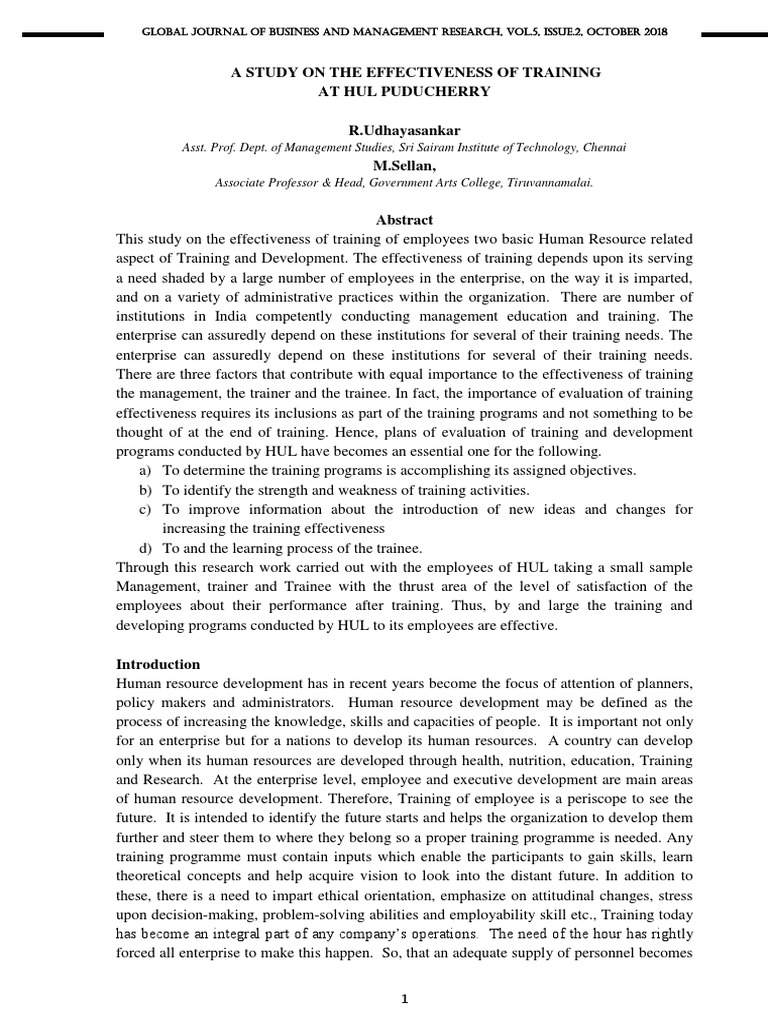 A Study On The Effectiveness of Training at Hul Puducherry R.Udhayasankar M.Sellan