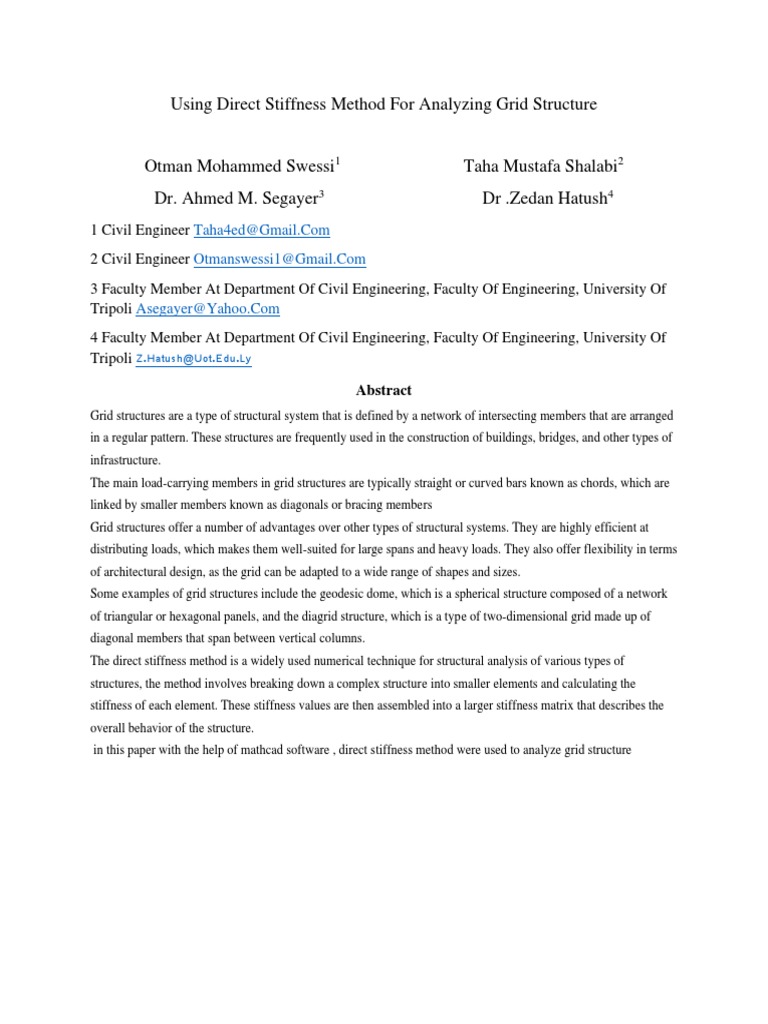 in this paper with the help of mathcad software , direct stiffness method were used to analyze grid structure