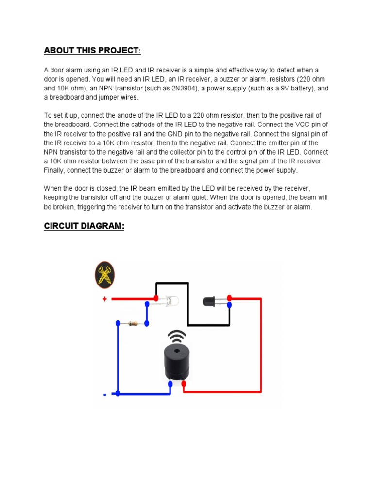door is opened. You will need an IR LED, an IR receiver, a buzzer or alarm, resistors (220 ohm
