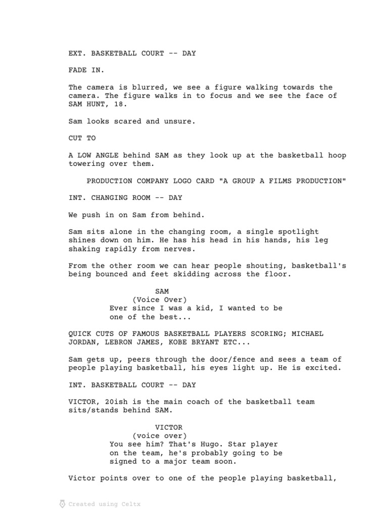 A LOW ANGLE behind SAM as they look up at the basketball hoop