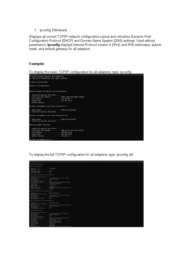 To display the basic TCP/IP configuration for all adapters, type: ipconfig